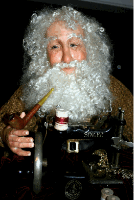 Santa wears burgundy silk velvet pants and a flannel shirt under his sweater. Black leather belt with gold buckle. Santa sits on a beautiful wood pedestal with his sewing machine, but everything is removable and he can sit alone on a table or positioned elsewhere. |